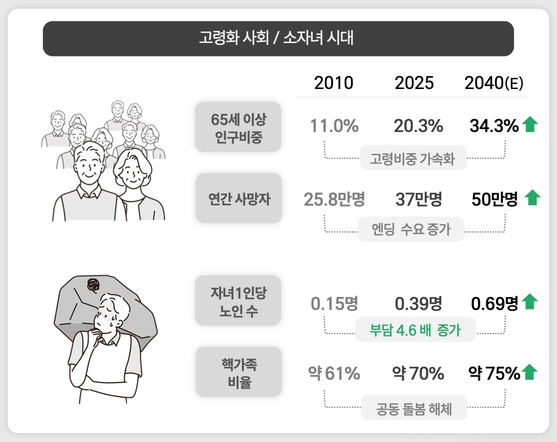 65세 이상 인구 비중은 2025년 20%를 넘었고, 연간 사망자 수는 37만 명에 이릅니다. 자녀는 줄고, 돌아가시는 분은 늘고 있습니다. 장례 이후 수개월의 일을 1~2명의 자녀가 감당해야 하는 시대입니다.